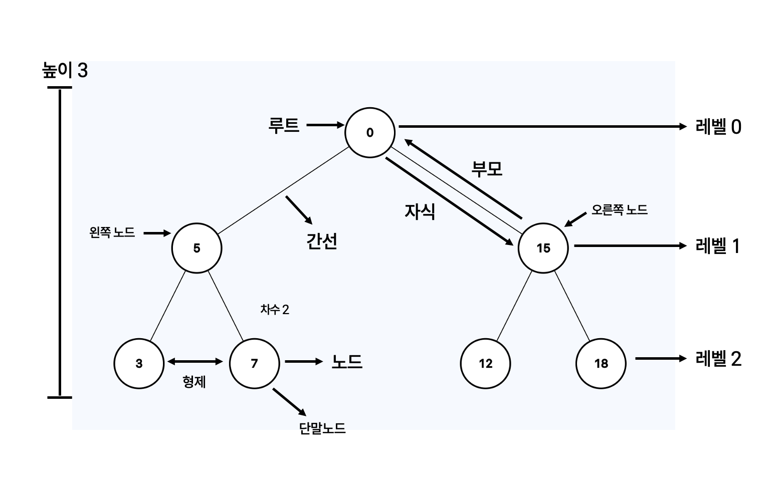 깊이/레벨: 루트에서 해당 노드으로 가는 최단 경로의 길이